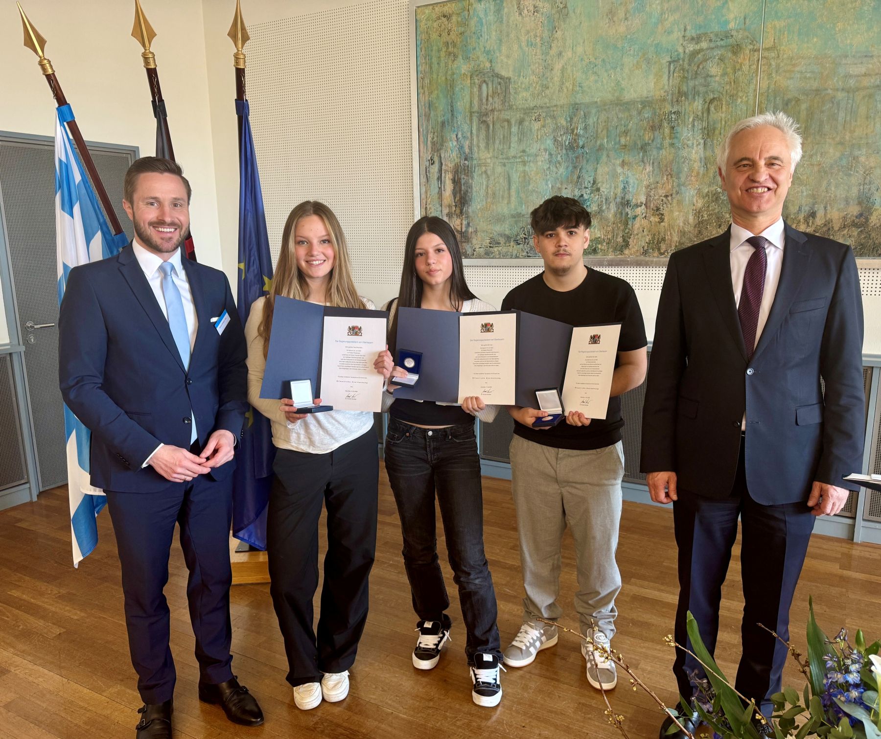 (v.l.n.r.): MdL Daniel Artmann, Frida Graumann, Mia Vujic, Alexandru-Andrei Györfi, Regierungspräsident Dr. Konrad Schober