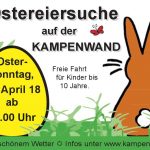 Am Ostersonntag, den 01. April, ist es wieder soweit. Der Osterhase höchst persönlich besucht die Kampenwandseilbahn in Aschau. An der Bergstation der Seilbahn wartet er ab 13.00 Uhr auf alle Kinder bis 10 Jahre, die mit ihm gemeinsam auf eine spannende Ostereiersuche gehen wollen.