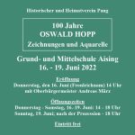Der Historische und Heimatverein Pang veranstaltet anlässlich des 100. Geburtstages vom Grafiker und Maler Oswald Hopp eine Gedächtnis-Ausstellung in der Aula der Grund- und Mittelschule Aising. Die Eröffnung durch Oberbürgermeister Andreas März ist am Donnerstag (Fronleichnam), den 16. Juni, um 14 Uhr. Die Ausstellung ist vom Donnerstag, den 16. Juni, bis Sonntag, den 19. Juni jeweils von 14.00 bis 18.00 Uhr geöffnet. Der Eintritt ist frei.