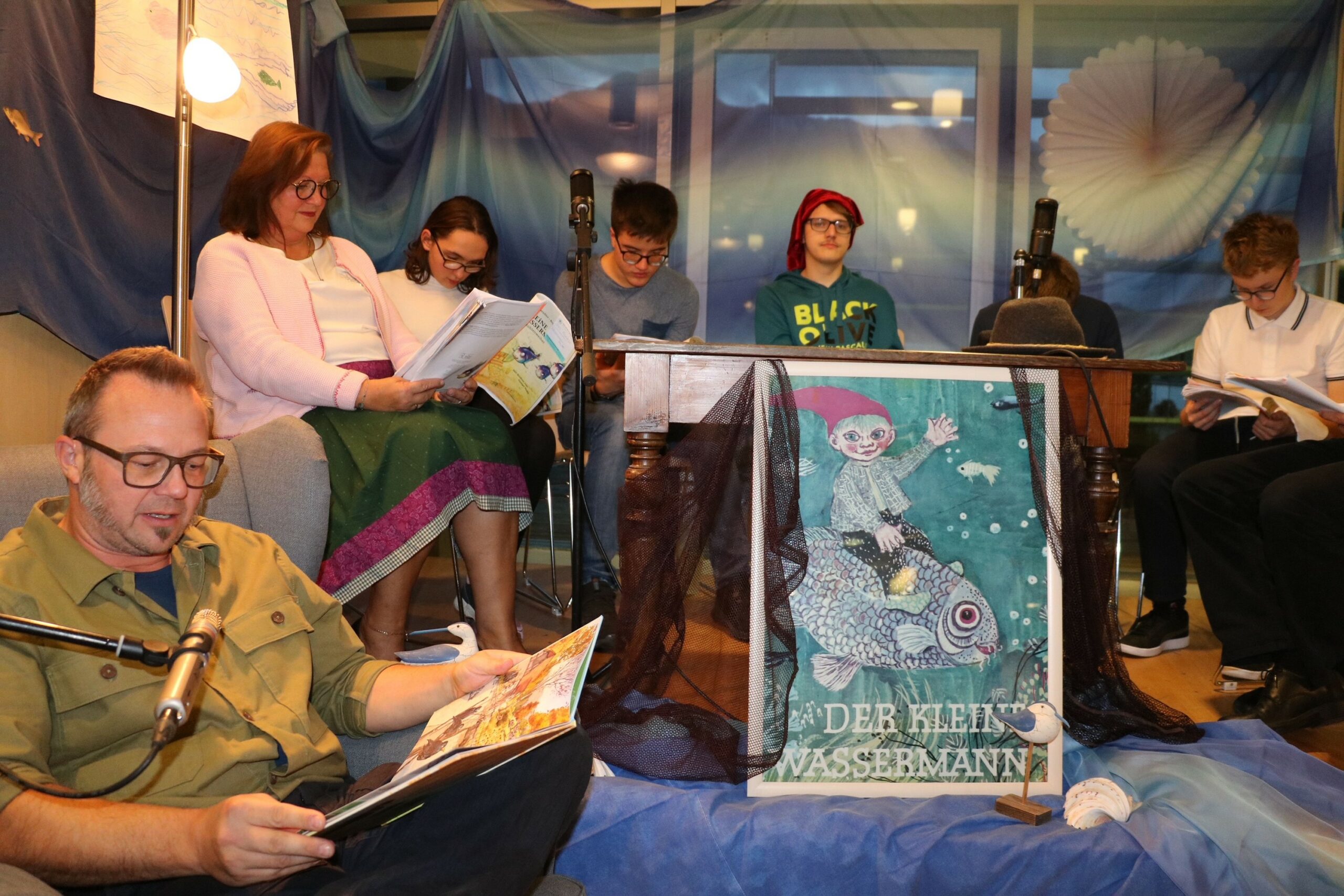 Der kleine Wassermann (Philipp-Manuel Riedel Mitte mit roter Zipfelmütze), der Erzähler (Leopold Wimmer vorne links) und die Figuren aus dem Mühlenteich bei der achten Otfried Preußler Gedächtnislesung im KIZ Aschau