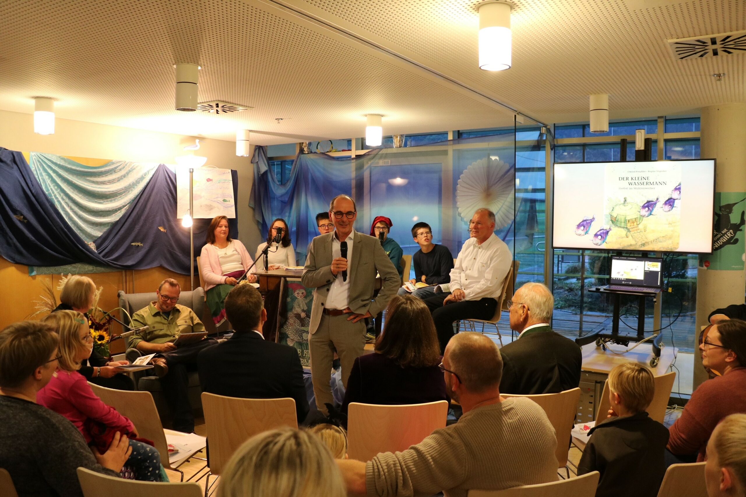 Geschäftsführer Peter Wichelmann begrüßt Landtagspräsidentin Ilse Aigner und die Gäste bei der achten Otfried Preußler Gedächtnislesung im KIZ Aschau zum 100. Geburtstag des Autors