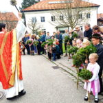 Zur Palmweihe vor dem katholischen Pfarrheim in Übersee schien die ganze Pfarrgemeinde auf den Beinen zu sein: feierlich eingeleitet von den Klängen der Blaskapelle sprach Pfarrvikar Pater Andrei einführende Worte und Gebete, bevor er rund um den Platz ging und die hunderten von großen und kleinen Palmbuschen weihte, die die festlich gekleideten Gläubigen und sehr viele Kinder in Händen hielten.