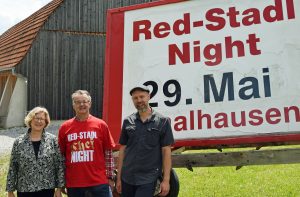 Vor einer aktuellen Partyreklame aus diesem Jahr posieren Museumsdirektorin Dr. Monika Kania-Schütz, der Leihgeber des Exponats Gerhard Blenninger und Künstler Dr. Alexis Dworsky. Der Werbewagen ist schon von weitem zu sehen und lockt die Besucher in die Zollinger Halle. Bildquelle: Bezirk Oberbayern, Archiv FLM Glentleiten
