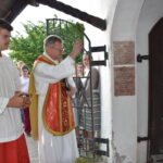 -Pfarrer Andreas Horn segnet die untere neue Tafel zur dankbaren Erinnerung für Revierförster Anton Pauli und Lehrer J. Nepomuk Adler