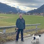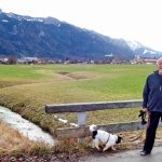 Fotos: Hötzelsperger – Prof. Peter Michael Hamel in seinem Komponisten-Büro und am Schafelbach mit seiner Hundedame Dona und mit Blick nach Aschau mit Burg Hohenaschau und Pfarrkirche „Zur Darstellung des Herrn“.