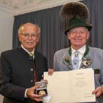 Foto 1: Bezirk Oberbayern/Wolfgang Englmaier – Bezirkstagspräsident Josef Mederer (links) überreichte die Bezirksmedaille an Peter Eicher.