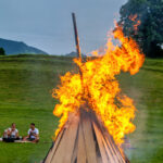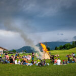 Bevor das Feuer entfacht wurde, sangen wir gemeinsam das Samerberg-Lied. Unsere Stimmen flogen über die Wiese, vom Wind getragen – manche ganz laut, andere eher leise, aber alle mit viel Freude. Und dann kam der Moment, auf den wir den ganzen Tag gewartet hatten: Das Feuer wurde angezündet! Erst züngelten kleine Flämmchen, dann zischte es laut – und plötzlich stand der ganze Holzhaufen lichterloh in Flammen. Wir sahen die Funken tanzen, rochen das Holz und spürten die Hitze. Das war richtig aufregend!