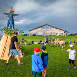 Der Weg war spannend, denn wir waren nicht allein. Viele Eltern, kleine Geschwister und sogar Omas und Opas begleiteten uns. Und als wir schließlich ankamen, staunten wir: Auf der Wiese stand ein riesiger Holzhaufen – aufgestellt wie ein Indianerzelt! Und dahinter: die Berge. Die Hochries leuchtete in der Ferne, und über uns zogen dunkle Wolken – aber es blieb trocken. Na ja, fast: Ein kurzer Schauer überraschte uns, aber wir flüchteten einfach in die große Scheune. Dort war es gemütlich – und das Beste: Wir durften ein neugeborenes Pony sehen!