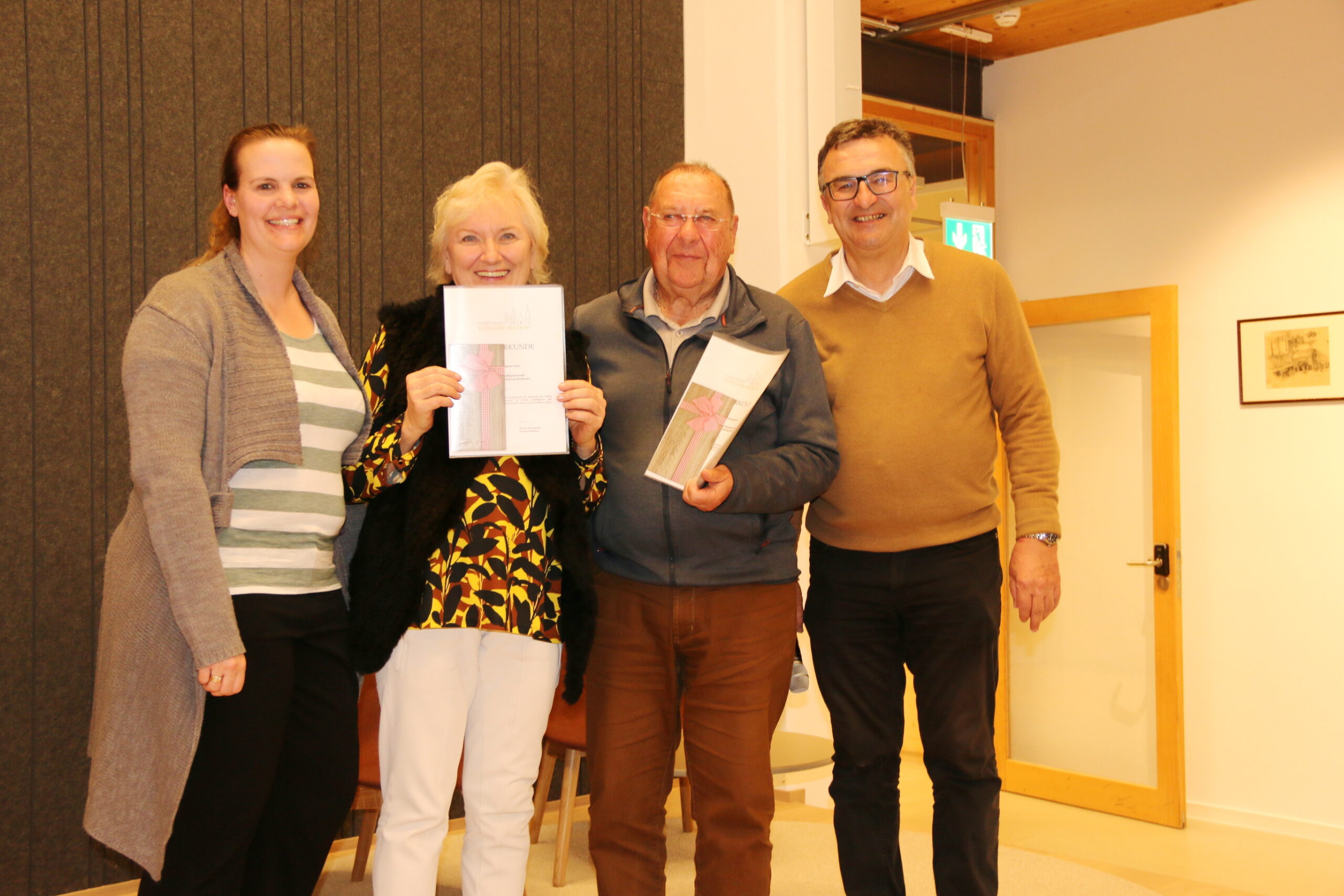 Pfarrer Christoph Rudolph und Monika Rummenholl von der Verwaltung mit den Geehrten Heinz Bergmeister und Margarete Peisl