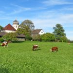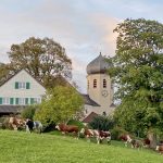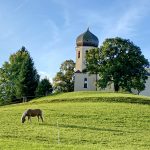 Einen schönen Beitrag zum Tierwohl leisten die Wiesen rund um die auf einem sanften Hügel erbauter Pfarrkirche “Christkönig” von Wildenwart. Wie diese Aufnahmen zeigen, fühlen sich auf der Nordseite die jungen Pferde geradeso wohl wie auf der Südseite die Kühe.