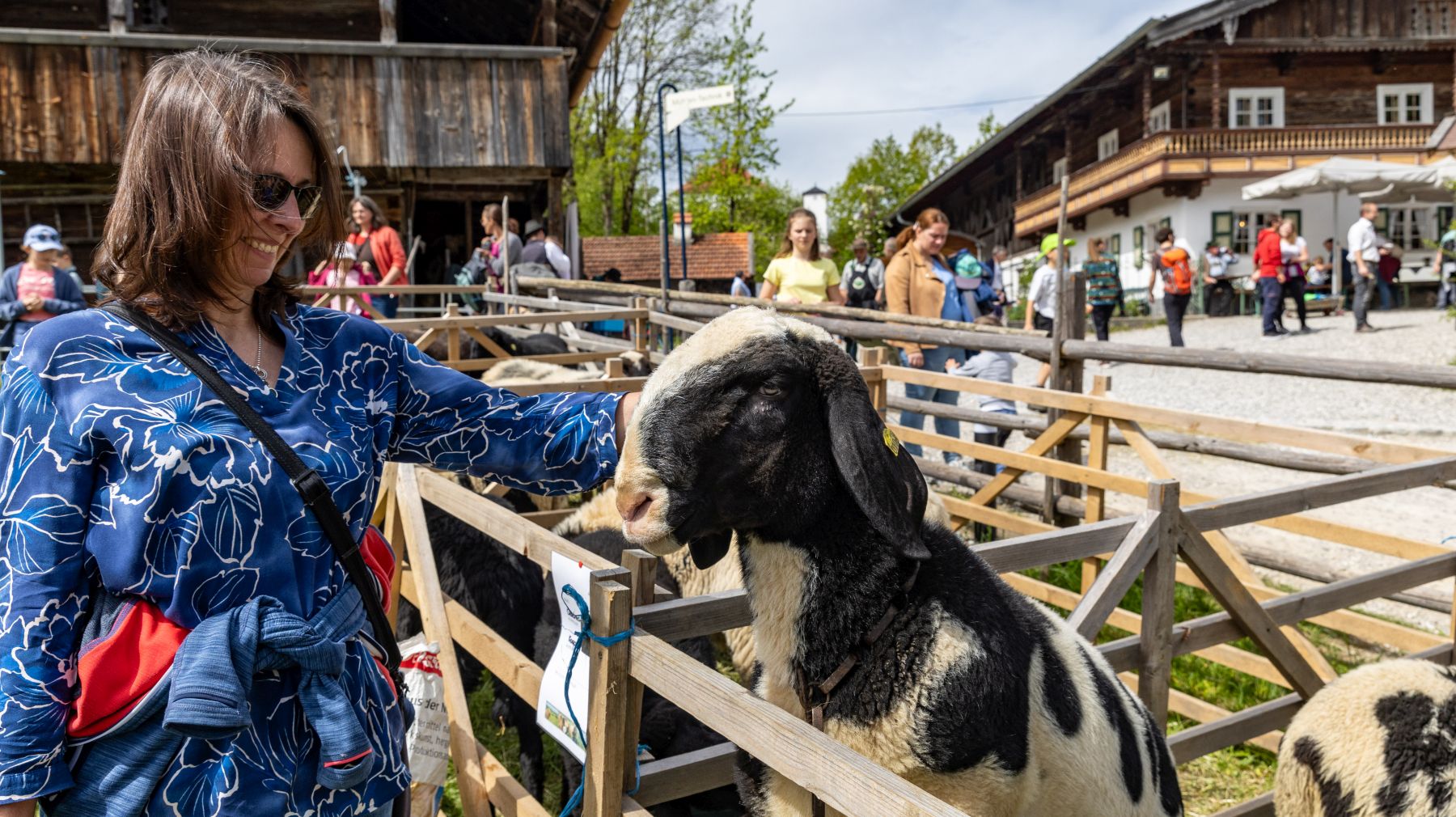 So kommt man Schafen nah – Besucherin Sylvia Rosenblatt im vergangenen Jahr auf dem Glentleitner Schaftag. Bildquelle: Bezirk Oberbayern, FLM Glentleiten, Foto: Sauer