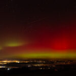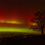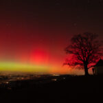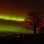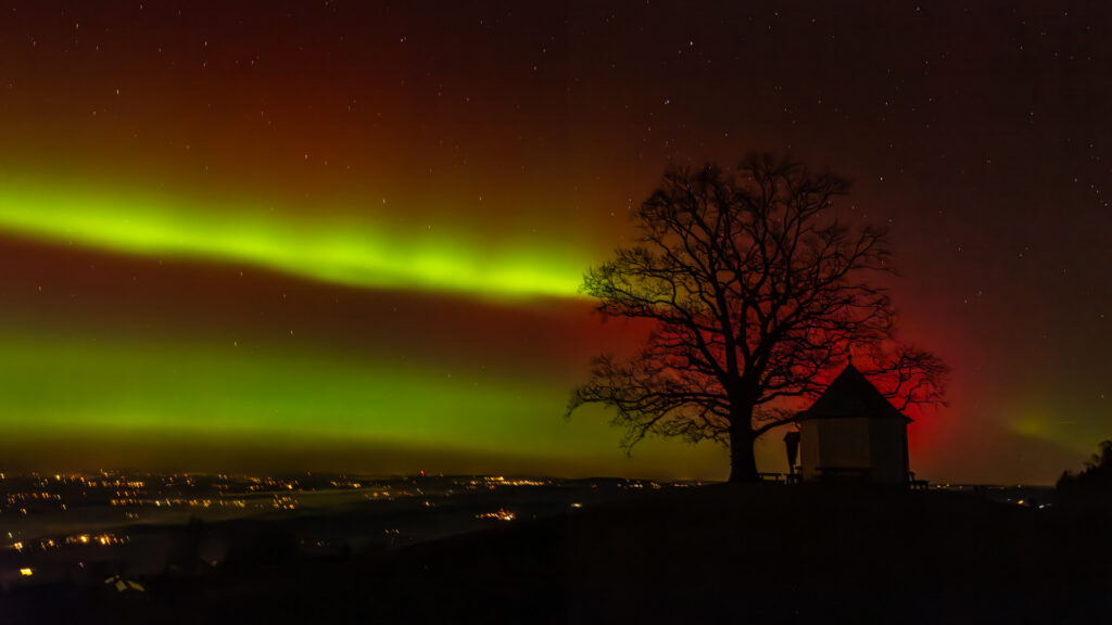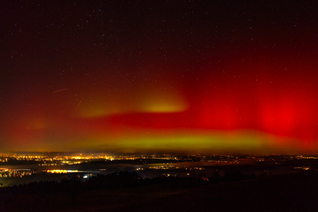 Samerberg – Es war eine dieser Nächte, in denen aus einem vertrauten Aussichtspunkt plötzlich ein Platz zum Staunen wird: Am späten Abend leuchteten über dem Samerberg Polarlichter in intensiven Rot- und Grüntönen. Über dem Nordhorizont lagen rötliche Schleier wie Vorhänge, darunter spannte sich ein breites grünes Band – deutlich mit bloßem Auge sichtbar. Viele Einheimische hielten das Naturschauspiel spontan mit dem Mobiltelefon fest.
