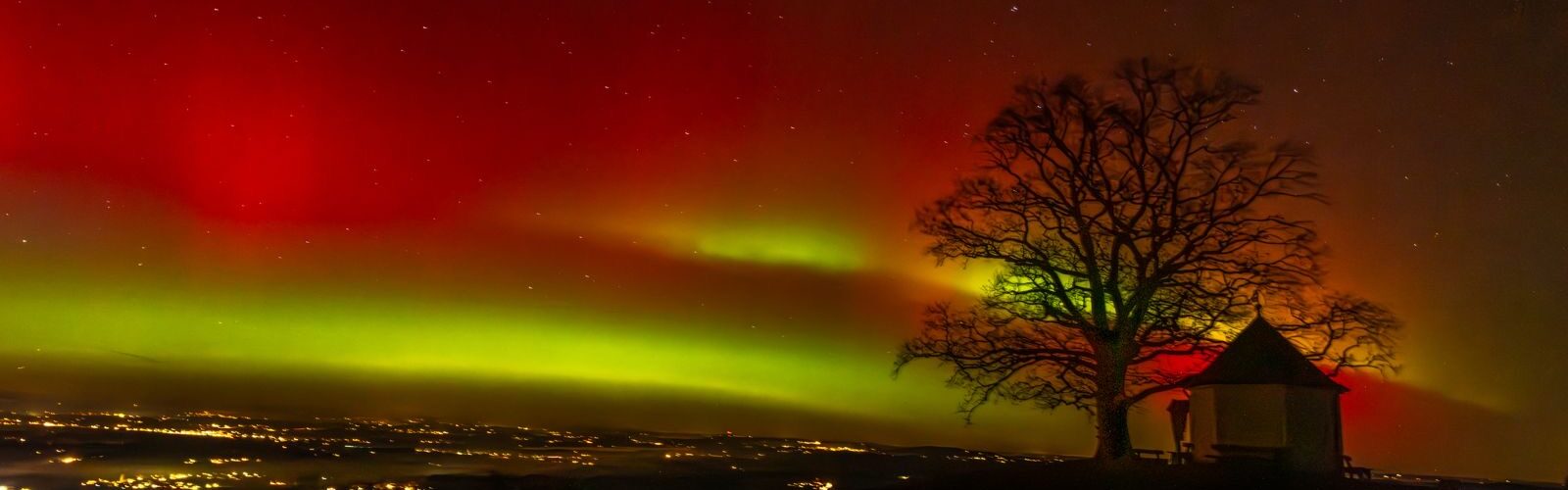 Samerberg – Es war eine dieser Nächte, in denen aus einem vertrauten Aussichtspunkt plötzlich ein Platz zum Staunen wird: Am späten Abend leuchteten über dem Samerberg Polarlichter in intensiven Rot- und Grüntönen. Über dem Nordhorizont lagen rötliche Schleier wie Vorhänge, darunter spannte sich ein breites grünes Band – deutlich mit bloßem Auge sichtbar. Viele Einheimische hielten das Naturschauspiel spontan mit dem Mobiltelefon fest.