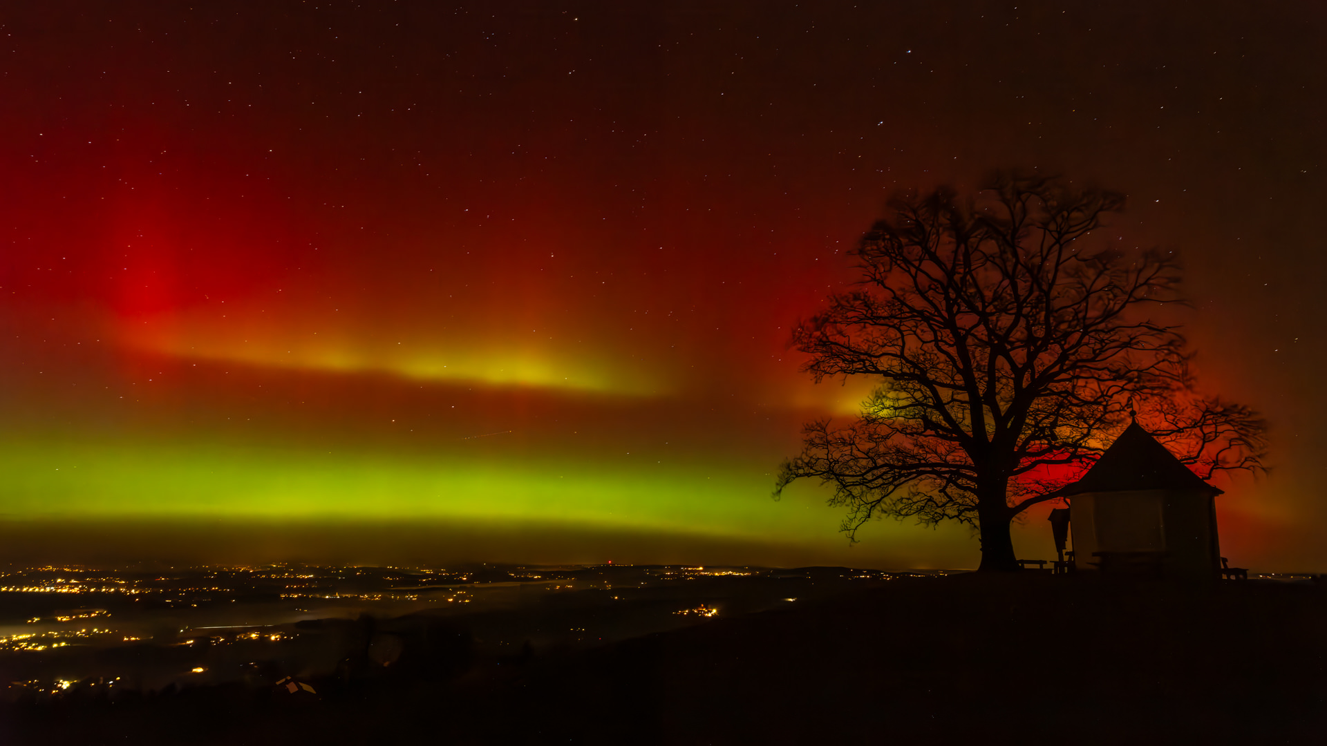 Polarlichter über dem Samerberg: Rot-grünes Himmelsspektakel an der Aussichtskapelle