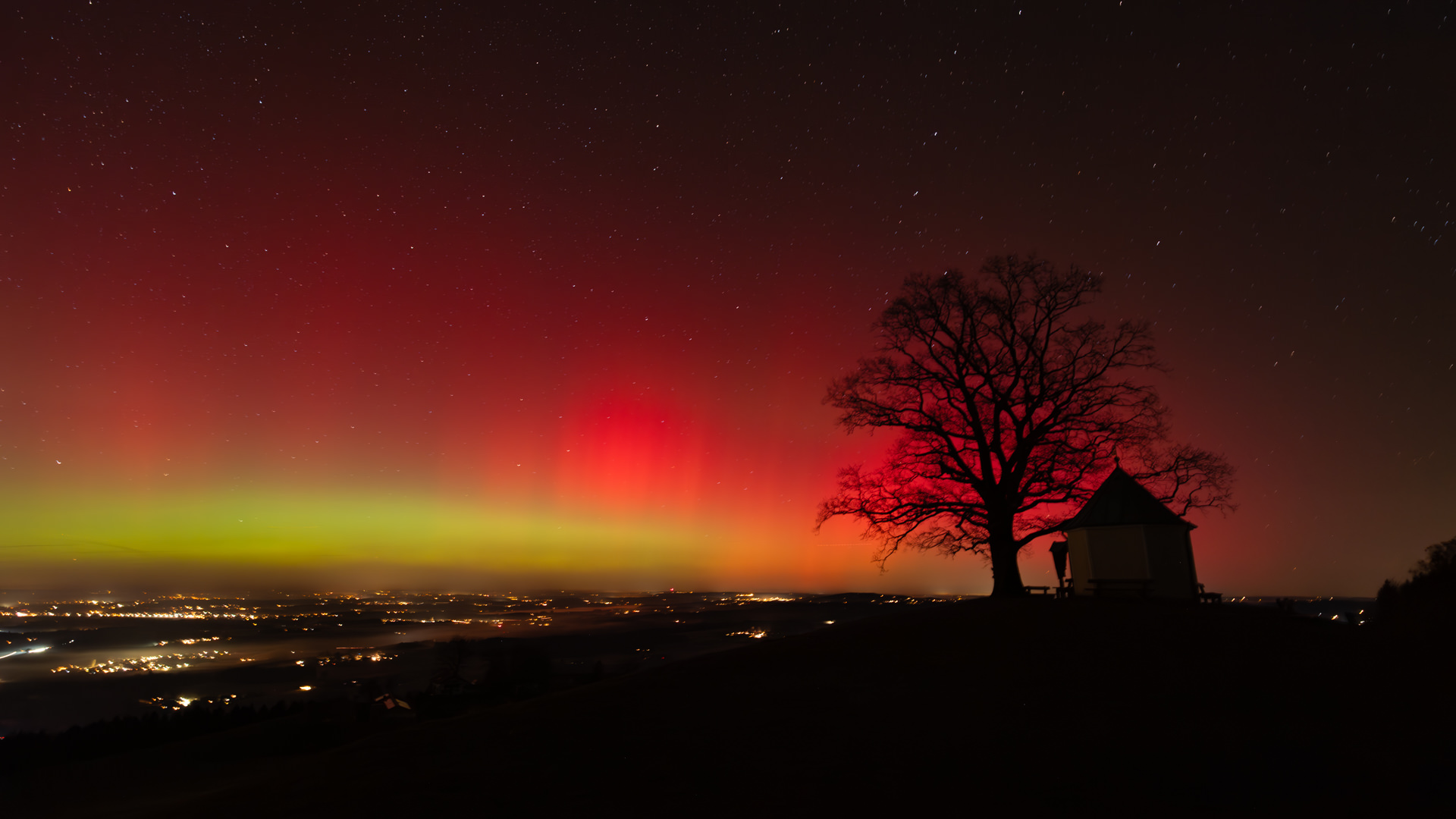 Polarlichter über dem Samerberg: Rot-grünes Himmelsspektakel an der Aussichtskapelle