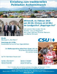 Der CSU Kreisverband Rosenheim lädt am Mittwoch, den 14. Februar, in den Landgasthof “Happinger Hof” zu ihrem politischen Aschermittwoch ein. Mit dabei sind die Kandidaten für die Bezirks- und Landtagswahl im Herbst MdL Klaus Stöttner, Günther Wunsam und Daniel Artmann. Beginn ist um 20 Uhr, Bewirtung ab 19 Uhr. Musikalisch wird die Veranstaltung von der Blaskapelle “Am Was’n” umrahmt.