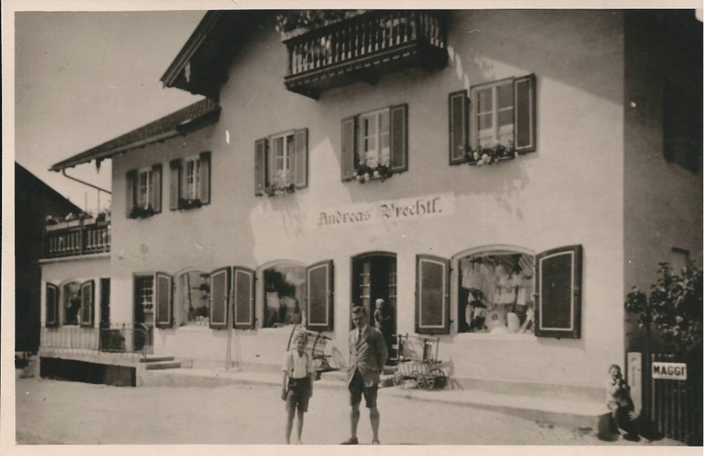 Andreas Prechtl II. im Jahr 1934 mit dem Nachbarsbub Wastl Schmid vor dem ersten Prechtl Lebensmittelladen am Bahnhof Raubling | Foto: Gemeindeverwaltung Raubling