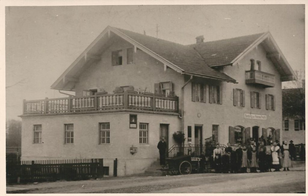 Kaufhaus Prechtl im Jahr 1909 mit allen Mitarbeitern. Das Geschäft befand sich unmittelbar am Bahnhof Raubling. Im linken Gebäudeteil mit den vergitterten Fenstern unterhalb der Terrasse war ein Bankfiliale untergebracht. | Foto: Gemeindeverwaltung Raubling