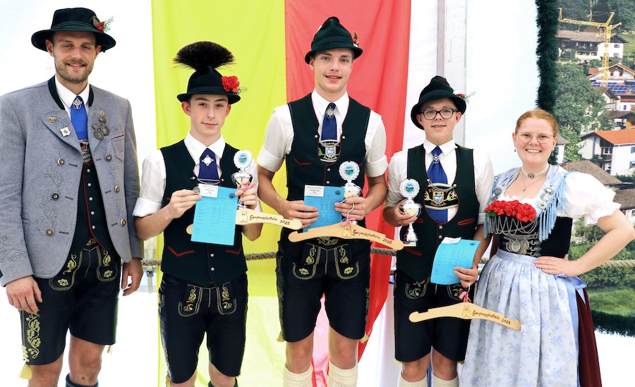 Sieger Altersklasse 4 (15 bis 16 Jahre) vlnr: 2. Gauvorplattler Rupert Treml, 3. Adrian Lackovic, Sieger Seppe Weinberger, 2. Peter Schlosser und 2. Gaudirndlvertreterin Kathrin Brem
