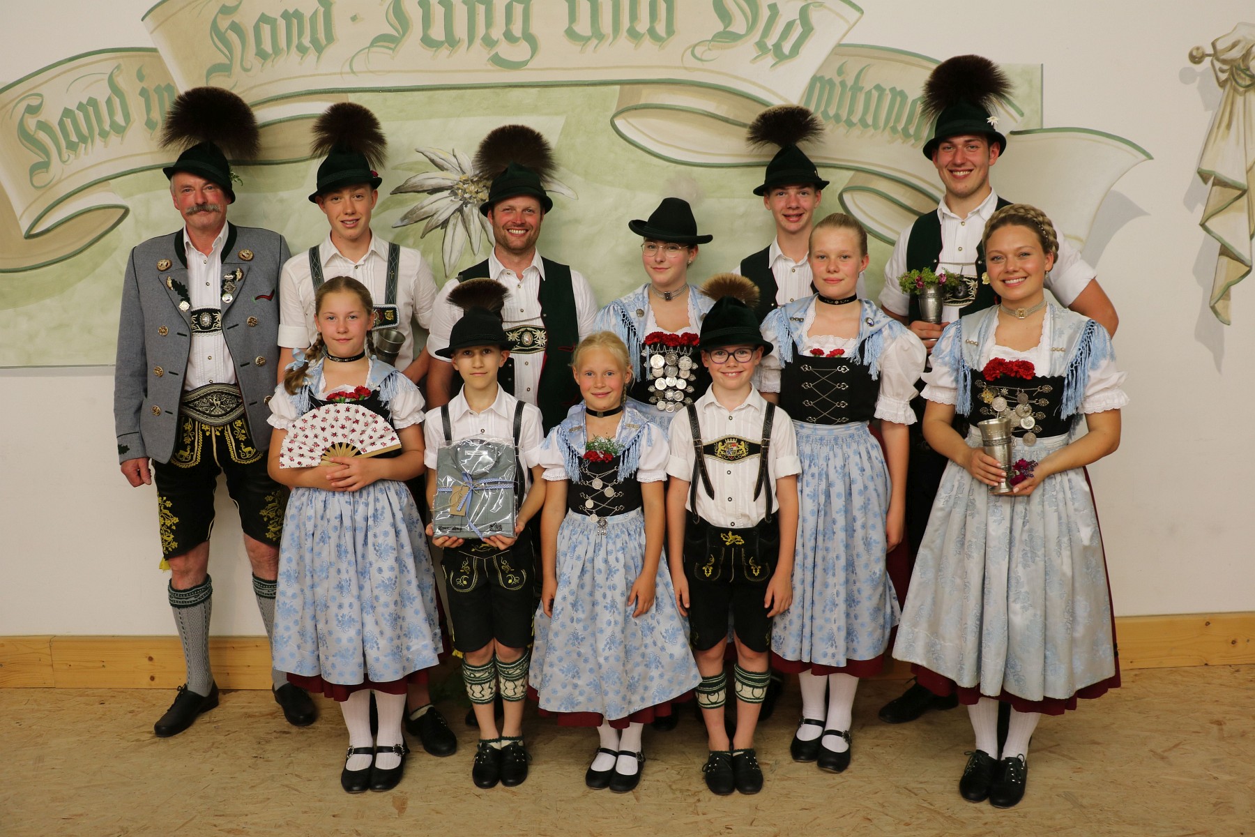 Vorstand Paul Kink vom Trachtenverein „Edelweiß“ Niederaschau (links) und die Sieger aller Klassen beim Vereinspreisplattln des Trachtenvereins „Edelweiß“ Niederaschau auf der Bühne im Chalet in Aschau