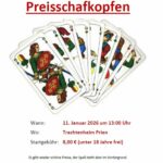 Der Trachtenverein Prien lädt am Sonntag, den 11. Januar 2026, wieder zu einem gemütlichen Preisschafkopfen ins Trachtenheim Prien ein. Beginn ist um 13 Uhr. Eingeladen sind sowohl Vereinsmitglieder als auch alle interessierten Schafkopffreunde.