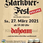 Fotos: Hötzelsperger – 1. Erinnerungen an die Priener Starkbierfeste der Vorjahre im König-Ludwig-Saal – 2. Plakat für das Online-Starkbierfest der Blaskapelle Prien am 27. März DAHOAM.
