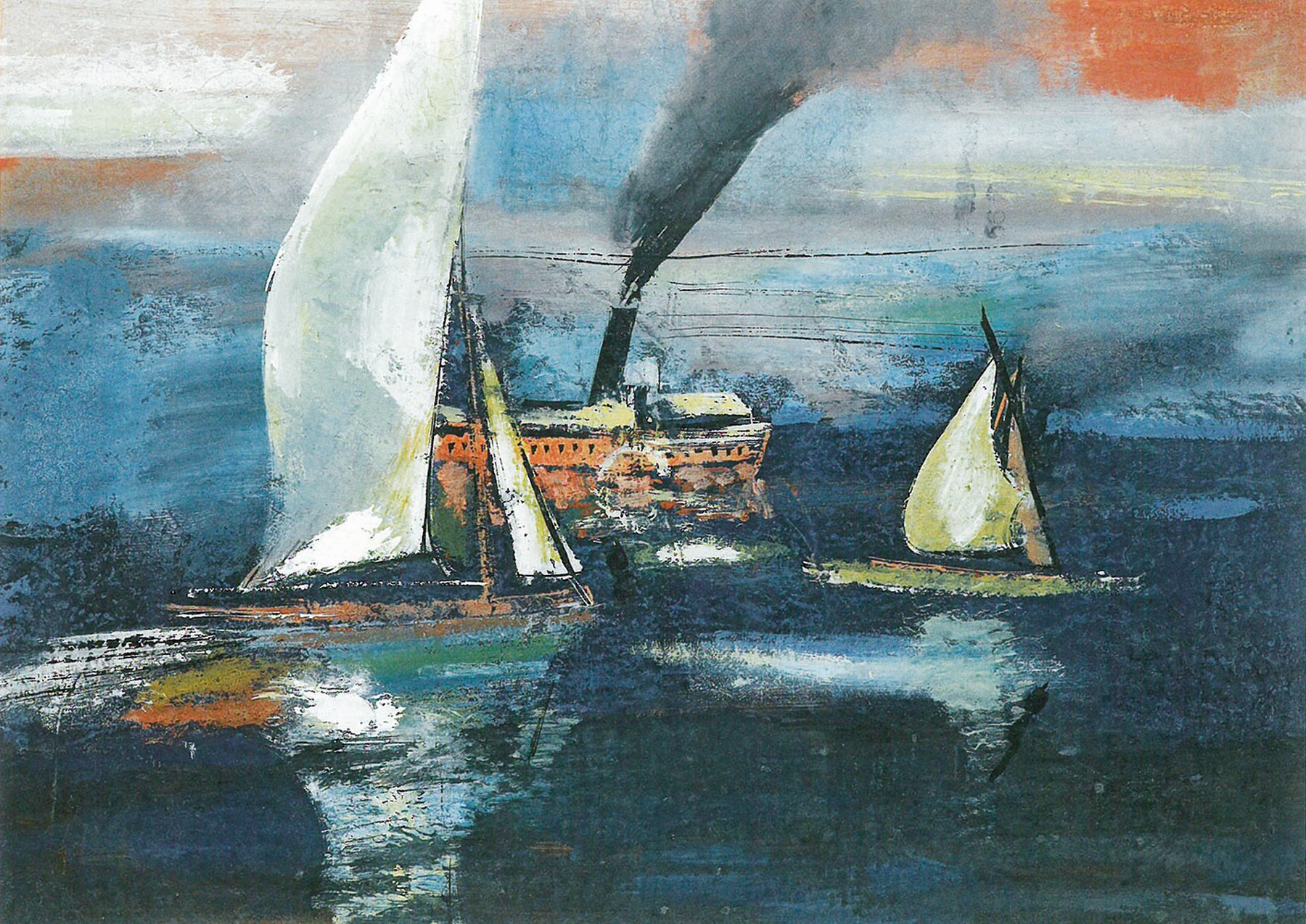 Bildrechte:Privatsammlung – Bildunterschrift: Raddampfer und Segelboote 1941, Tempera