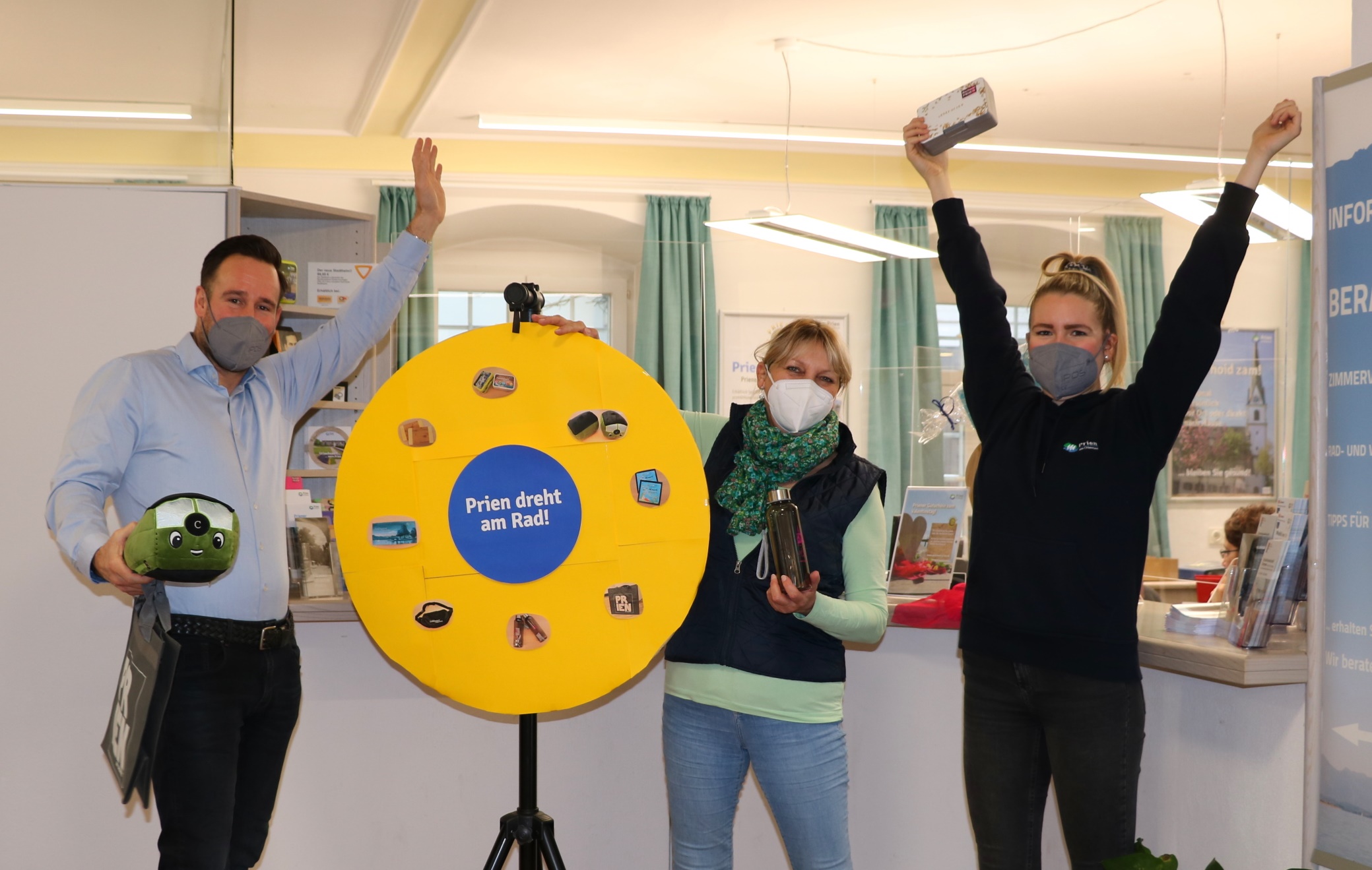 Prien dreht am Rad – das närrische Treiben wie vor Corona ist auch 2022 nicht möglich. (v.l.n.r.) Der Leiter des Tourismusbüros Prien Florian Tatzel und seine Kolleginnen Gaby Hauk und Magdalena Berka bereiten das Glücksrad für die Gutschein-Faschingsaktion vor.