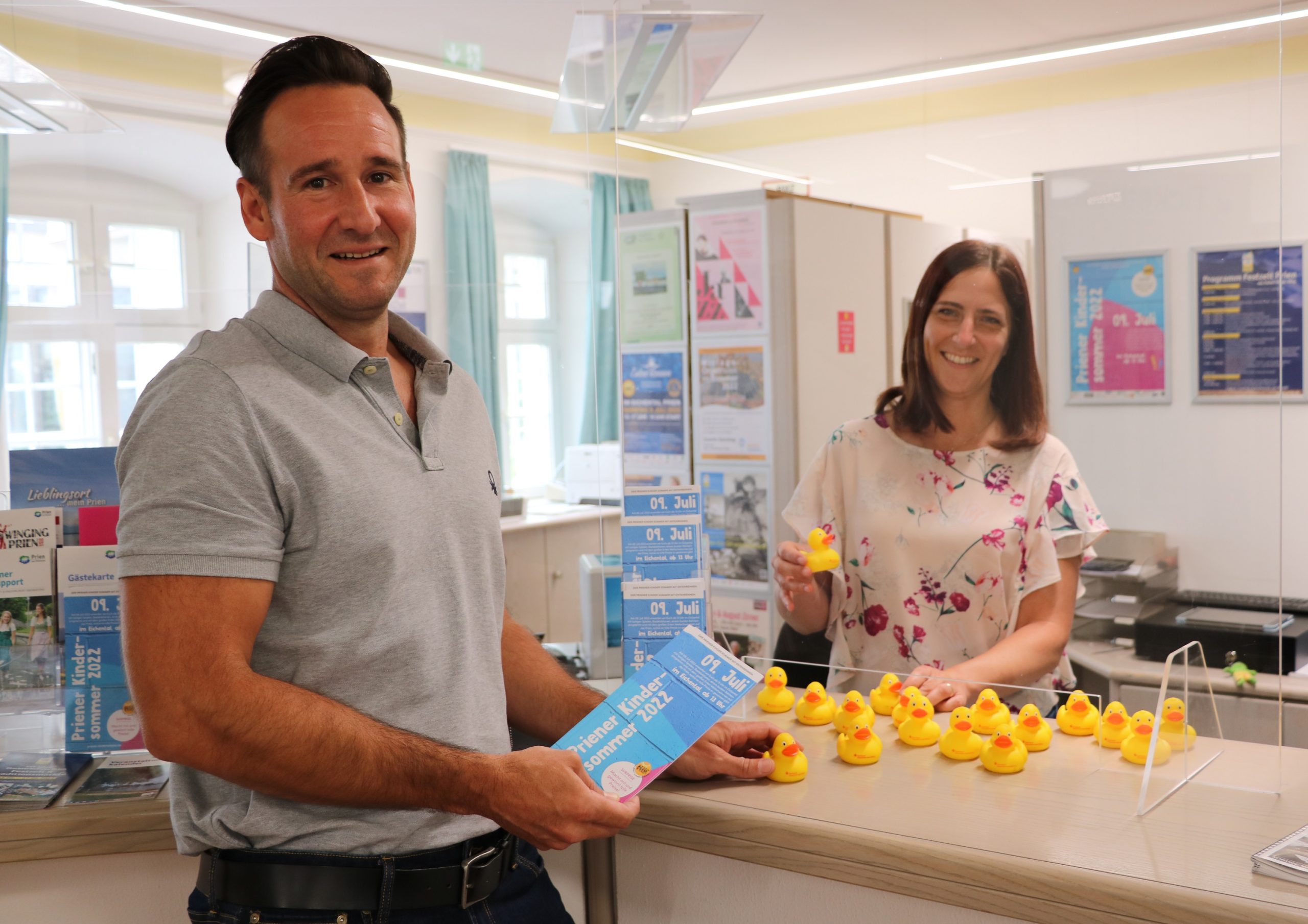 Ab sofort sind die Enten für das Rennen bei den Mitarbeiter:innen der Prien Marketing GmbH (im Bild v. li.: der Leiter des Tourismusbüros Florian Tatzel und seine Kollegin Andrea Stephan) erhältlich. Neben dem Tourismusbüro Prien werden diese bei allen Priener Kindertagesstätten, bei der Sparkasse Prien und natürlich beim Priener Kindersommer am Lions Stand zum Verkauf angeboten.