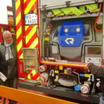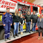 Fotos: Hötzelsperger – Am neuen Feuerwehrauto LFKatS der FFW Atzing versprach Priens Lions-Präsident Alexander Hagenbrock (re.) der Jugendfeuerwehr Atzing eine Spende in Höhe von 1.000 Euro, vertreten von links: Lukas Huber, Anna Boggusch, Sophia Riepertinger, Vorstand Martin Loferer und Georg Müller.