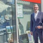 Foto: Stampfl – Helga Stampfl mit Sparkassen-Geschäftsstellenleiter Alexander Hagenbrock vor dem Fenster mit einem Teil der Tombola-Preise
