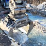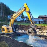 Bergen Weißache: Uferbaustein für Uferbaustein hebt der Baggerfahrer aus dem Wasser und baut sie in die Uferböschung ein.