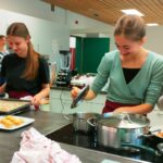 Das Menü für die Gäste war ein wahrer Gaumen- und Augenschmaus: nach der Begrüßung mit einem gesunden alkoholfreien Drink und kleinen, selbst gebackenen Brötchen folgte ein köstliches Menü mit fünf Gängen, wobei nur heimische Produkte verwendet wurden: auf Fenchelsuppe mit Speck und Mandeln, dazu frischem Brot, gab es einen Süßkartoffelravioli mit Rote Bete Carpaccio, Rucola und Feta, dann eine Quiche mit Spargel, Lachs und Rucola, sodann „Hähnchenspieße“ mit Ananassalsa Sesamöl und Mandelsoße. Zum krönenden Abschluss folgte ein kreisrunder Cheesecake mit Erdbeeren und verschiedener Mouse au chocolat. Dazu wurden jeweils die passenden Getränke angeboten. Auch ein Espresso durfte nicht fehlen und ganz zum Schluss ein kleines Geschenk für jeden Gast– ein Tütchen mit köstlichen selbst gebackenen Plätzchen.