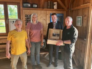 Gruppenbild vor der Hütte – Personen: vorne von links Peter Nentwig, Georg Hermannsdorfer (Ausbilder der Chiemseenaturführer und Fischspender), Michaela Sichler (mit Geschenkbox), Christine Haslbeck, Jürgen Pohl (Vereinsvorstand), Ursel Bernritter, Robert Görig, stehend von links: Konrad Hollerieth, Claudia Lorenz-Berthold, Klaus Blank, Christina Erl-Danhof, Arnulf Himmel, Bürgermeister Andreas Fenzl, Sylvia Posch)