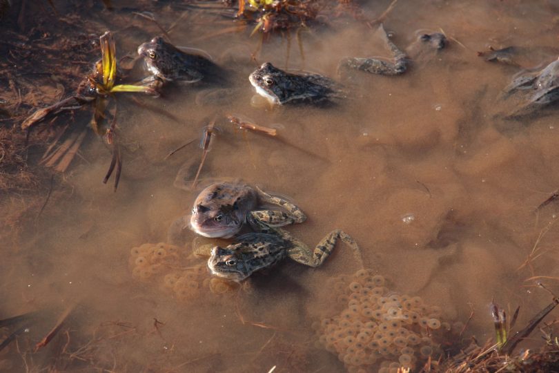 Der Grasfrosch (Rana temporaria) kommt in ganz Bayern vor, er hält sich besonders gerne in Biberrevieren auf. Sein Laichteppich ist oft quadratmetergroß.