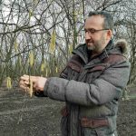 Die Sträucher werden in den ersten Jahren durch gezielten Baumschnitt zu einem Baum mit Krone entwickelt. Diese Arbeit findet in der Regel von Februar bis Mai statt und kann bis zu 8 Minuten je Strauch in Anspruch nehmen. In der Jugendentwicklung kann die Krankheit Pseudonomas Probleme bereiten, die über Frostrisse unter die Rinde und in den Stamm eindringen kann. Um dem entgegen zu wirken, wurden die Stämme mit Kalk weiß angestrichen. Aktuell findet die Blüte der Haselnuss statt. Nach der Bestäubung kann es bis in den Mai dauern, bis die Befruchtung abgeschlossen ist. Ein Hauptschädling ist der Haselnussbohrer, der im Mai die Pflanzen emporklettert. Für Stimmer sind Sorten wichtig, bei denen sich die Nuss leicht von der Hülse trennen lässt, damit die weitere Verarbeitung problemlos läuft. Inzwischen wurde die Technik für Ernte, Wäsche, Sortierung und Kühlung der Früchte selbst angeschafft. Durch die Kühlung können von der Ernte weg bis etwa Weihnachten Frischnüsse angeboten werden. Viele Kunden schwören darauf. Die kleinen Nüsse werden für die Nager-Mischung verwendet, Mittlere von der Schale befreit und die großen Früchte kommen in die Premium Mischung, die für den menschlichen Verbrauch, aber auch für Nagetiere geeignet ist. Die regionalen Nüsse können das ganze Jahr über im Onlineshop www.haselnuss24.de bestellt werden. Insgesamt hat sich die Arbeit auf dem Hof durch die Umstellung von Milchvieh auf Haselnüsse sehr gewandelt. Martin Stimmer verbringt den halben Tag damit, die Bestellungen und Anfragen in Büro zu bearbeiten und die Ware versandfertig zu machen. Die ganze Familie ist dabei mit eingebunden. Erst nach dem Mittagessen ist Zeit für anderen Arbeiten auf seinem Hof, z.B. auf seinen Getreidefeldern.