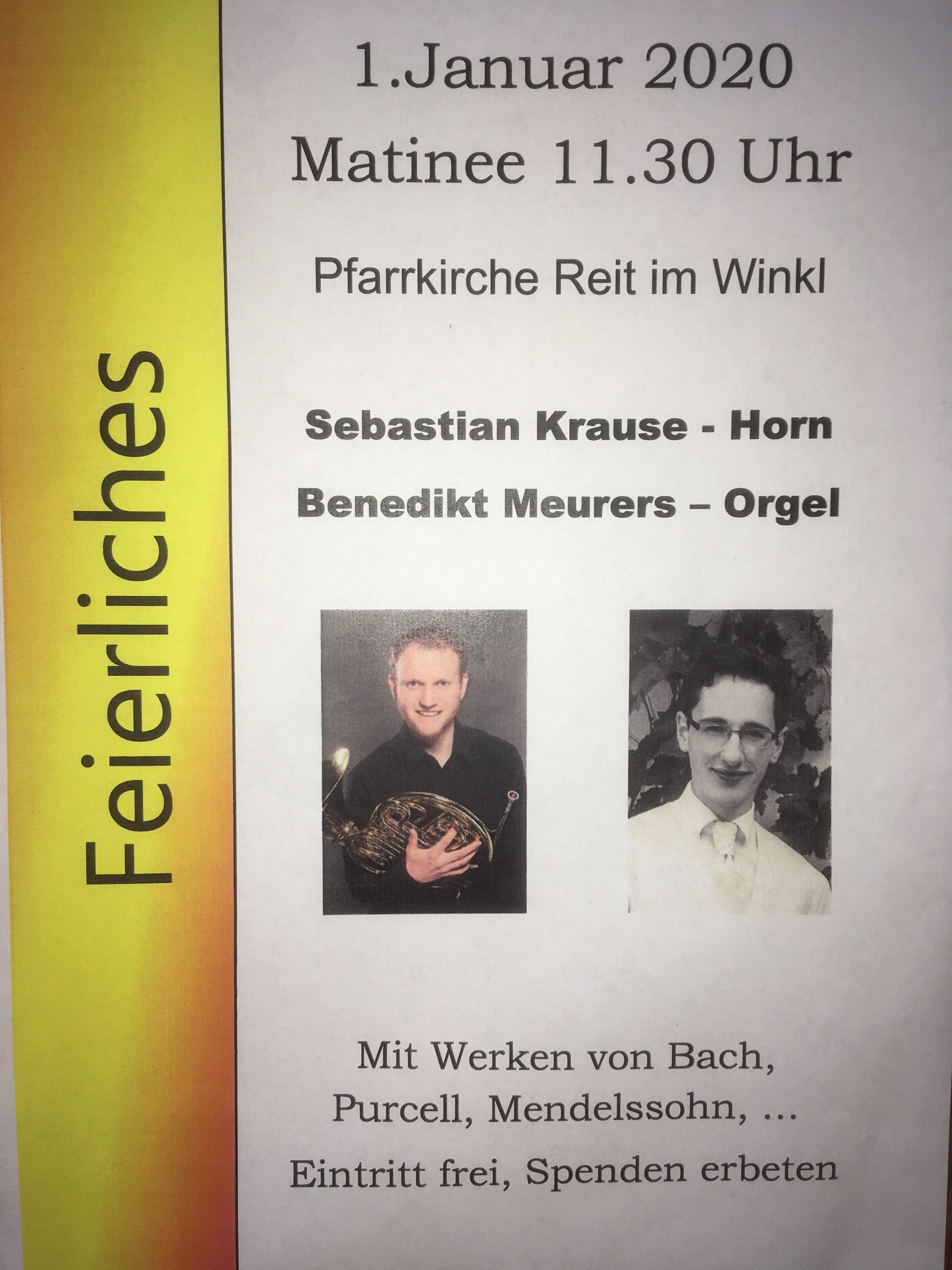 wir dürfen Sie herzlich zur feierlichen Matinee mit Horn & Orgel am Neujahrstag in die Pfarrkirche in Reit im Winkl einladen. Los gehts am 1.1.20 um 11:30.