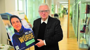 Erzbischof Heiner Koch mit Aktionsplakat