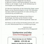 Neu ab Sommer 2017 wird im Theaterzelt in Riedering das Stück „ELIAS“ gespielt – Premiere ist am Freitag, 26. Mai um 18 Uhr. Termine zum Spiel des wundertätigen Propheten und weitere Informationen gibt es im Internet unter www.himmegugga.de.  Reservierungen sind nur am Telefon täglich von 8 Uhr bis 12.30 Uhr (ausser an Sonn- und Feiertagen) unter 08036-6749544 möglich. Spielbeginn ist immer um 18 Uhr, Einlass ist ab 17.15 Uhr bei freier Platzwahl. Brotzeit und Getränke an der Theaterbar gibt es ab 16.30 Uhr.