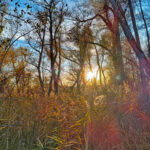 Im November dreht das Wetter noch einmal richtig auf. Bei strahlendem Sonnenschein blinzelt die Sonne wunderbar durch den schönen Auwald. Am Uferrand konnte ich ein Teichhuhn entdecken, während sich der zweite Vogel etwas versteckter hielt. Bei genauem Hinschauen erkennt man eine Bekassine. In den bunten Herbstblättern bringt der Eisvogel eine zusätzliche, schöne Farbe ins Spiel – ein wunderbares Bild.