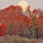 Zum Abschluss erhob sich der riesige Vollmond hinter der herbstlich glühenden Landschaft, während die Sonne unterging. Der Mond steht dieser Tage besonders nah an der Erde, und der kleine weiße Fleck daneben entpuppt sich als eine schöne Kornweihe. Damit sind bereits die ersten Überwinterer aus dem hohen Norden eingetroffen.