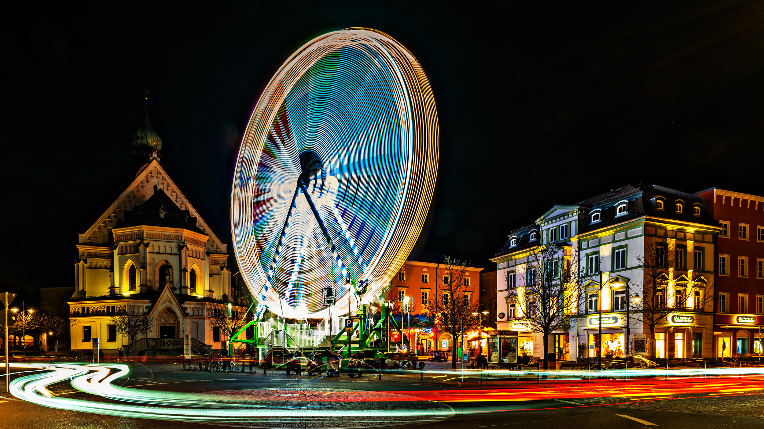 Das Rosenheimer Riesenrad in stimmungsvollen Langzeitbelichtungen