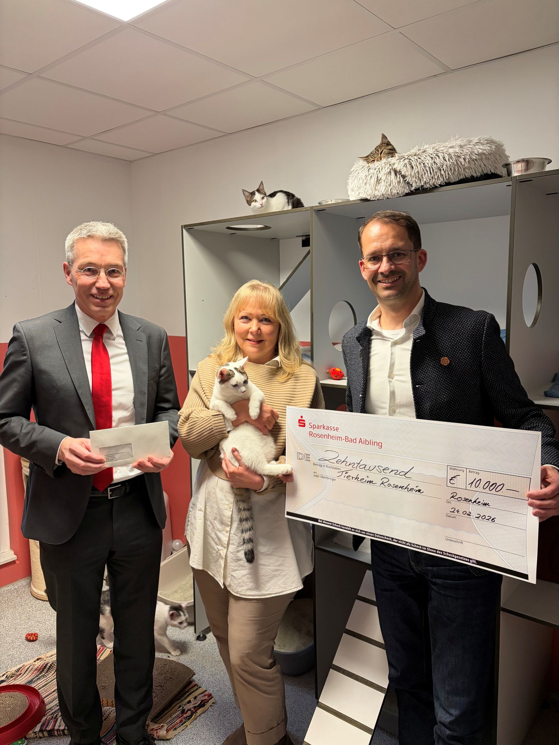 Oberbürgermeister Andreas März und Landrat Otto Lederer übergaben heute nach dem öffentlichen Hilferuf der 1. Vorsitzenden des Tierschutzvereins Rosenheim e.V. Andrea Thomas insgesamt 20.000 Euro