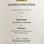 Zum 25jährigen Ehrenamts-Jubiläum kamen Falk Brem, Leiter des Vermessungsamtes Rosenheim und Priens Erster Bürgermeister Andreas Friedrich zum Salmerhof nach Prutdorf. Brem bedankte sich mit einer Urkunde vom Bayerischen Staatsminister der Finanzen und für Heimat Albert Füracker bei Robert Rupp für dessen verdienstvolles Wirken als Feldgeschworener sowie mit einem persönlichen Brief von Landrat Otto Lederer. In diesem schreibt er unter anderem: „Auch in Zeiten satellitengestützter Datenerfassung ist das Ehrenamt des Feldgeschworenen von besonderer Bedeutung. Problematische Fragen zu Grenzziehungen und –verläufen lassen sich oftmals durch beste Kenntnis der Lage von Grundstücken und den Anliegern im persönlichen Gespräch lösen, wozu die Feldgeschworenen unverzichtbare Dienste leisten“. Auch Priens Erster Bürgermeister Andreas Friedrich würdigte den Dienst für die Allgemeinheit mit einem Präsent der Gemeinde. Der Bürgermeister erzählte dabei, dass er im Jahr 2006 in seinem ersten Lehrjahr in der Gemeinde Prien mit dem damaligen Bürgermeister Christian Fichtl bei einer Grenzbegehung von Wildenwart nach Frasdorf dabei war, darauf Robert Rupp. „Stimmt, das war im November bei Schneeregen, da kamen wir waschelnass zur Brotzeit in die Schlosswirtschaft“. Beim weiteren regen Austausch wurde daran erinnert, dass es seit dem 12. oder 13. Jahrhundert Feldgeschworene gibt, und dass das Amt des Feldgeschworenen eines der ältesten noch erhaltenen Ämter der Kommunalen Selbstverwaltung ist. „Den Titel eines Feldgeschworenen behält man im übrigen ein Leben lang, man ist auch dann noch Titelträger, wenn man sich auch schon zur Ruhe gesetzt hat. „Aber das ist ja bei Ihnen, Herr Rupp noch lange nicht zu erwarten“ – so Falk Brem bei der kleinen Feierstunde in der guten Stube des Salmerhofes.