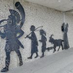 Das Stahlscherenschnitt-Kunstwerk „Römische Familie“ schmückt eine Betonwand am nördlichen Ende der Straße „Am Chiemseepark“ in Seebruck  –  Foto: Markus Müller