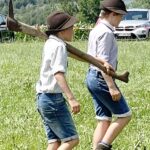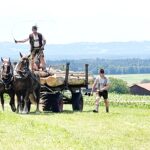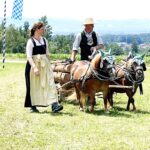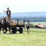 Ganztägig waren Festzelt- und Wiesenplatz eine Augenweide für Liebhaber von Trachten, heimischem Handwerk und Freunde der Landwirtschaft. Besonders die Rosserer präsentierten historische Arbeitsweisen beim Transport von Holz. Sepp Furtner erläuterte bei der Vorführung, wie es früher war, als es noch keine Bulldogs für das Heimbringen der zuvor mit Handarbeit gefällten Baumstämme gab. Mit dabei waren unter anderem Sebastian Ruhsamer aus Söllhuben mit einem Minigespann und Hans Wallner aus Prien, der zudem an die Tradition der Goaßlschnalzer erinnerte. Eine weitere Erinnerung an frühere Arbeitsweisen war ein Wagen mit ryhthmischem Dreschen des Getreides per Hand. Eine besondere Freude hatten Kinder und Jugendliche, die einen kleinen Ausflug auf einem Almkarren mitmachen durften, der von Pferden gezogen wurde.