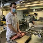 5 Korbinian Schmid (links im Vordergrund), Tobias Kloo (daneben rechts im Hintergrund), Vanessa Bucchi (ganz hinten)und David Brand (ganz hinten) bei der Vorbereitung der Kalbsinvoltini und Spargelravioli