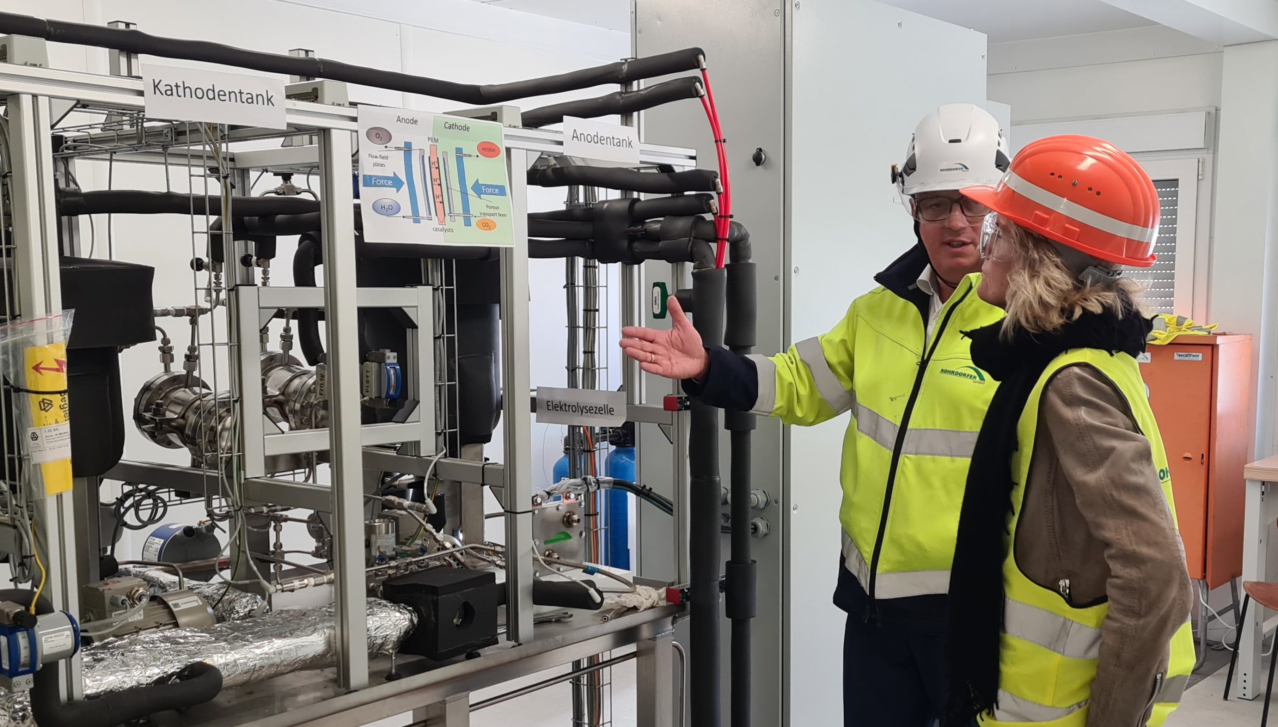 Dr. Helmut Leibinger, Leiter des Net Zero Emission-Teams bei Rohrdorfer, erklärt Daniela Ludwig die Versuchsanlage, die das CO2 in Ameisensäure umwandeln soll. (Copyright Rohrdorfer)