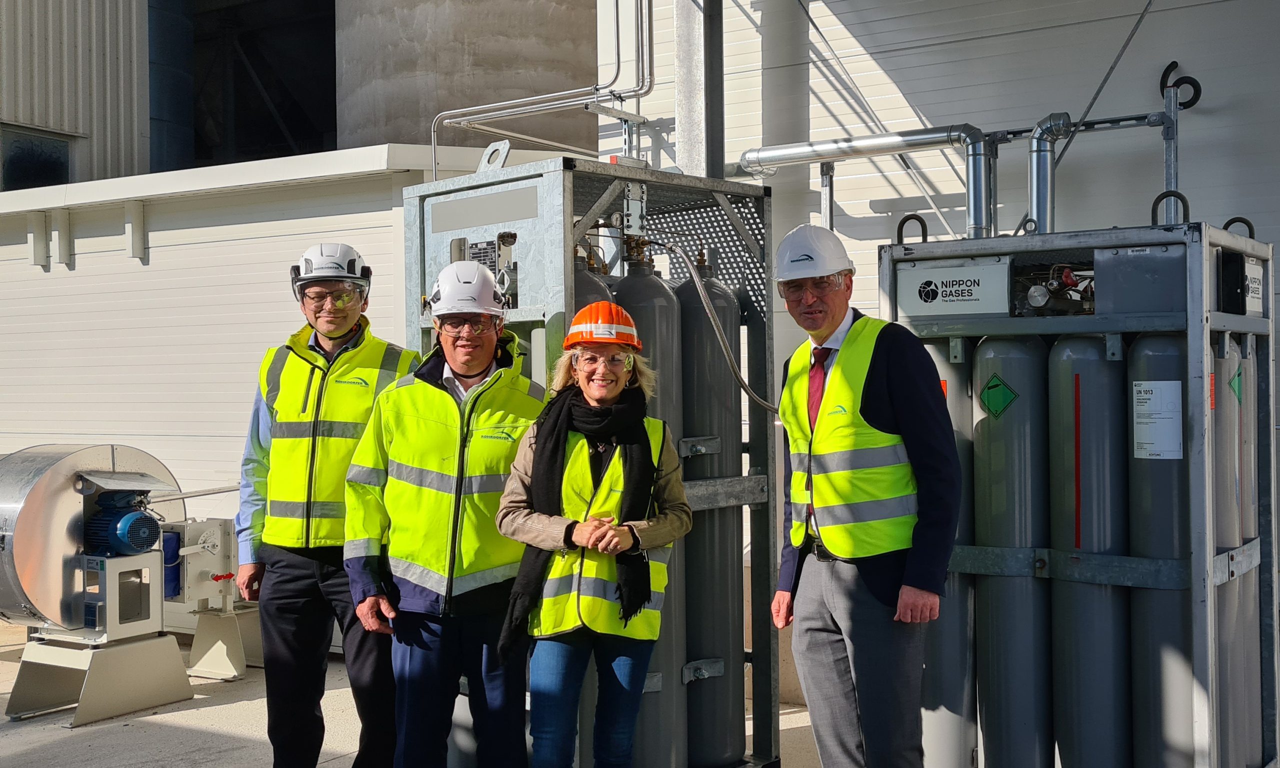 Von Links: Anton Bartinger, technischer Leiter der Sparte Zement bei Rohrdorfer, Dr. Helmut Leibinger, Leiter des Net Zero Emission-Teams bei Rohrdorfer, MdB Daniela Ludwig und Mike Edelmann, Geschäftsführer der Rohrdorfer Unternehmensgruppe vor den Druckbehältern die das in der Abscheideanlage gewonnene CO2 enthalten. (Copyright Rohrdorfer)