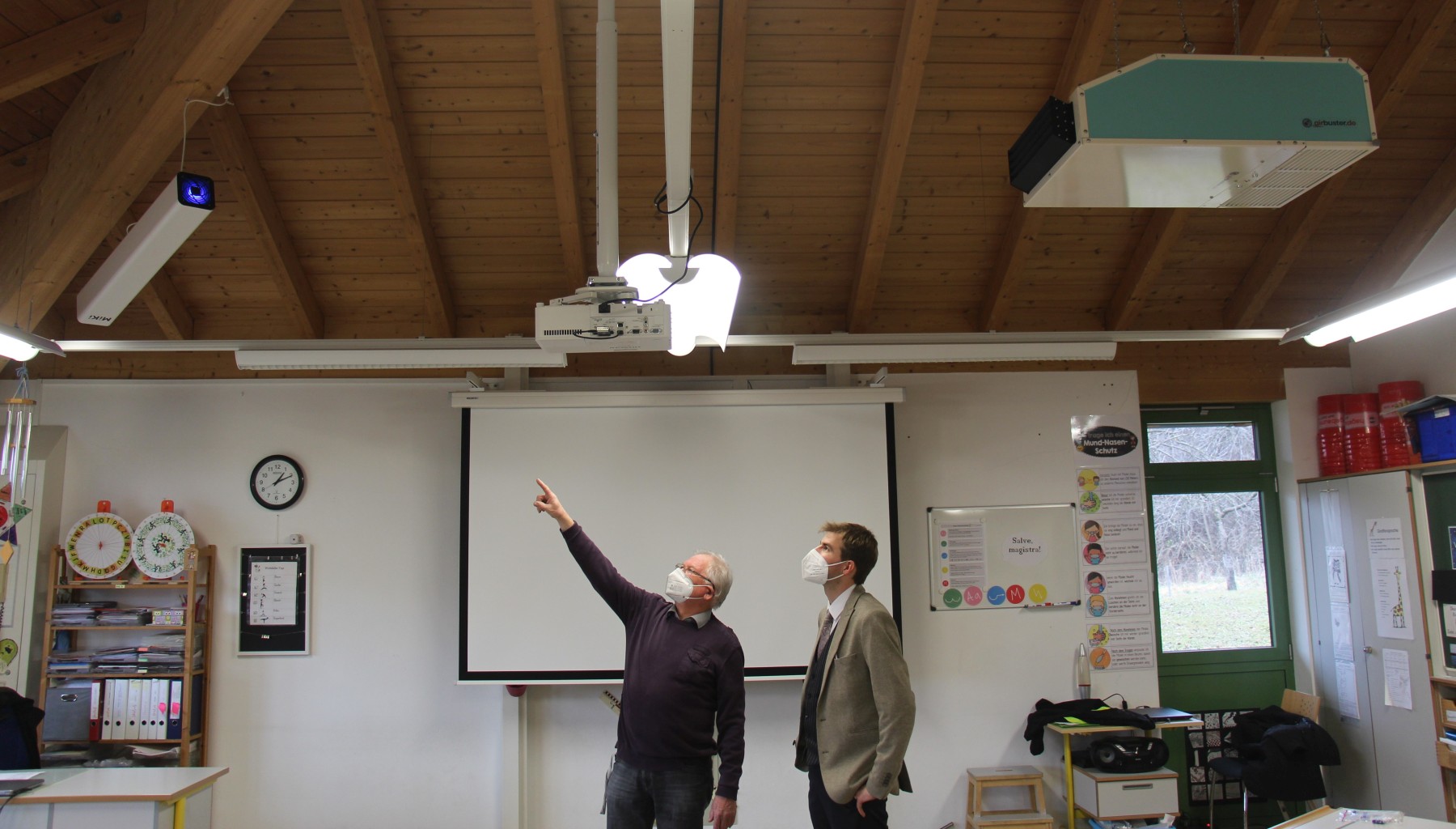 Bodo Frommelt und Bürgermeister S. Hausstetter begutachten die installierten Luftreinigungsgeräte